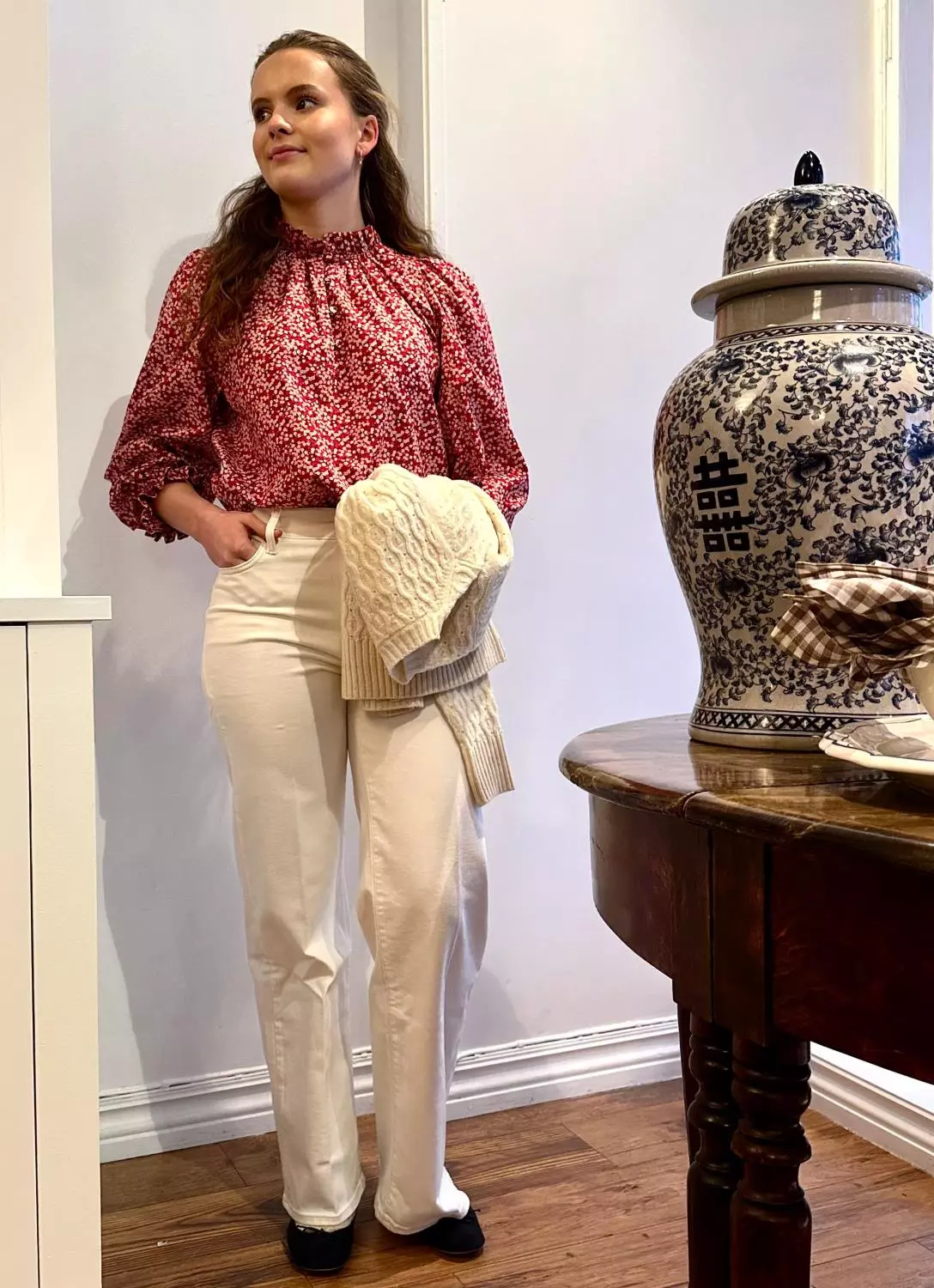 The Annabella Blouse in Mitsi Valeria print features a deep red base adorned with tiny white flowers. Her ruffle details at the neckline and cuffs combined with a slightly relaxed fit create a romantic yet timeless blouse.