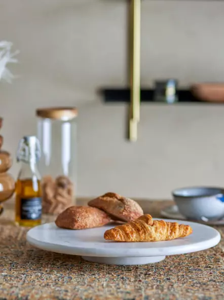 Denne enkle og elegante dreieskiven er laget i hvit marmor, noe som virkelig bidrar til den sofistikerte følelsen den gir. Den lave profilen og den brede, flate platen gjør denne dreieskiven perfekt for servering av tapas, kaker, ost eller annen mat som er vakker i seg selv og som trenger å bli behandlet og vist frem med respekt. Fordi denne dreieskiven ikke har noen hevede kanter, er det enkelt å skjære i maten du legger på den.