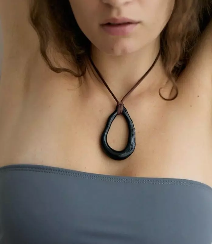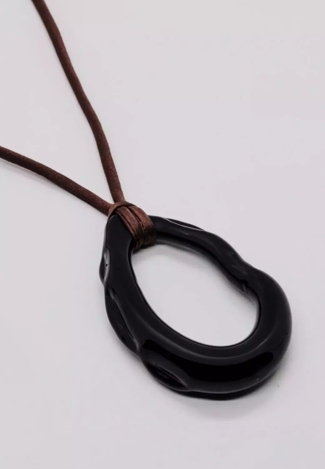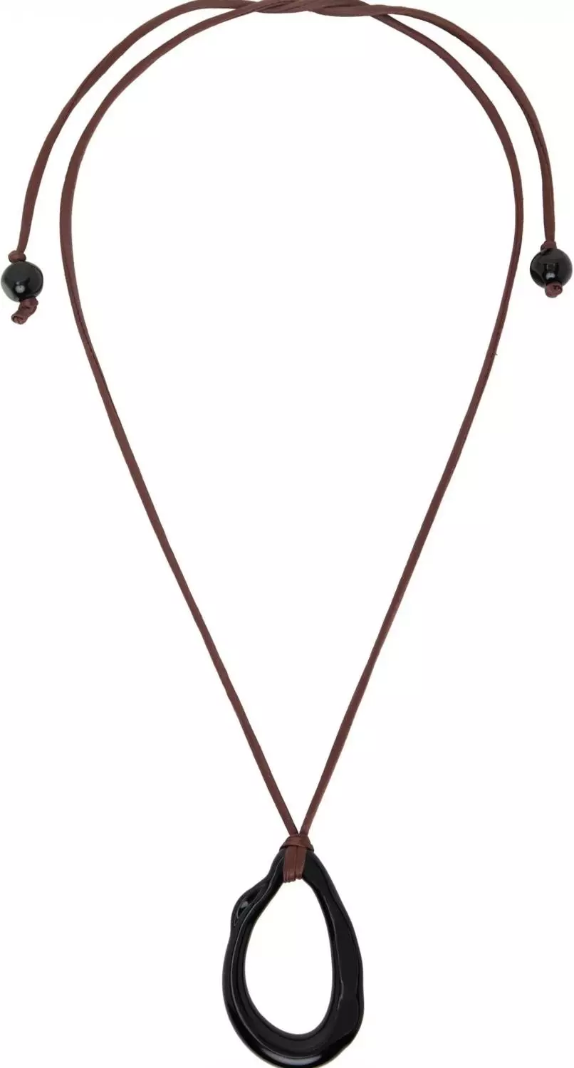 En svart glassring festet til et sjokoladebrun morbærsilkestropp med uregelmessige glassperleender. Kjedet knyttes i knute for å justere lengden.
