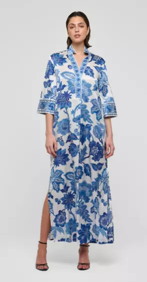 A true Dea Kudibal classic, Helga is a relaxed fit full length dress with a kimono style neckline, stand collar and 3/4 length wide sleeves. This version comes in silk with a bold print of blue flowers and an elegant contrast print border on the cuffs and neck.