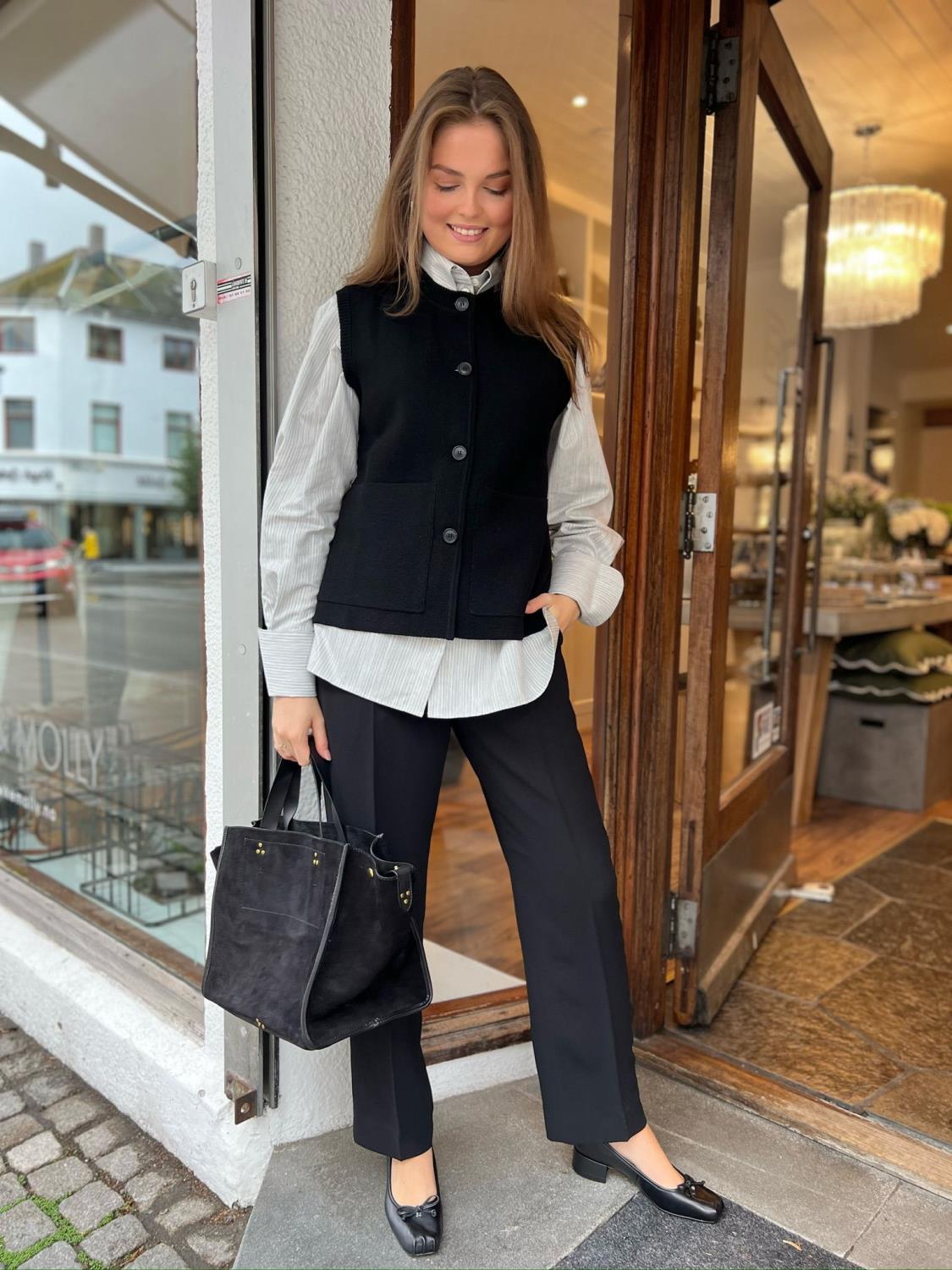 Skjorten er et raffinert plagg som forestiller minimalistisk luksus med sitt gjennomtenkte design. Den har knappelukking, avrundet krage og høye mansjetter, noe som skaper en elegant og arkitektonisk silhuett. Perfekt for et sofistikert utseende med røtter i nordisk estetikk.