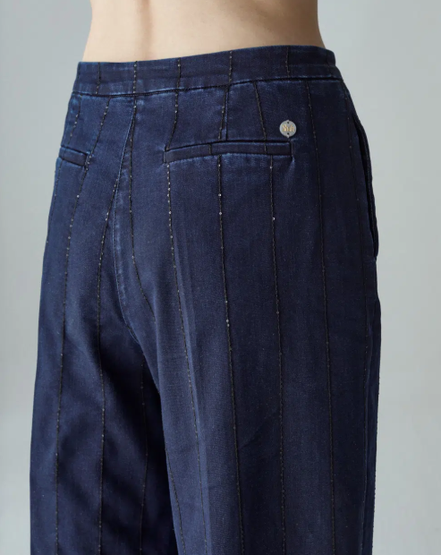 Chinojeans med høy midje laget i Italia, utsvingte ben, sidelommer og glidelås foran. I oversized blå paljett.